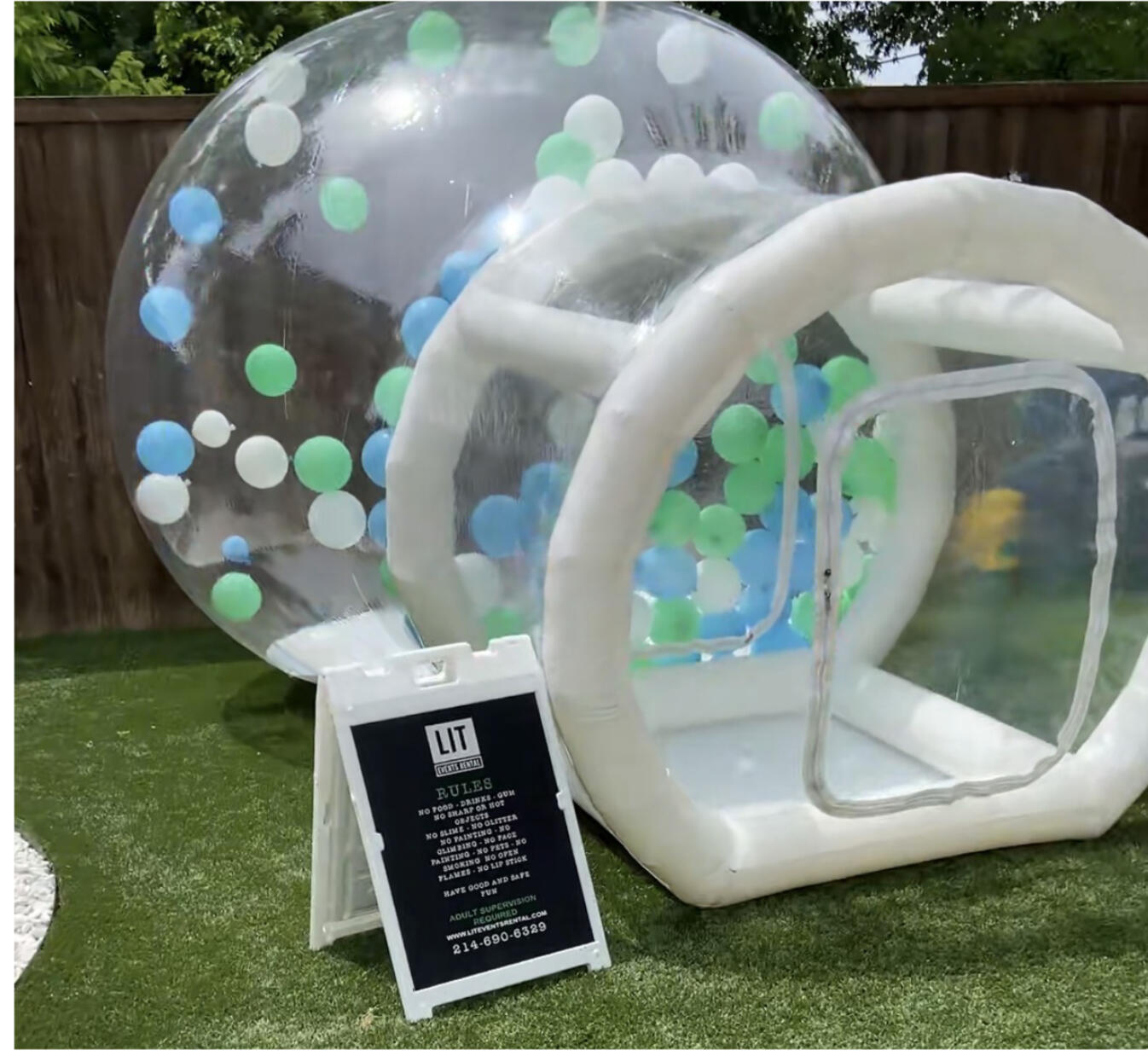 The Bubble House is the newest party trend and creates a unique experience for any celebration. Size 6ft X 10ft.